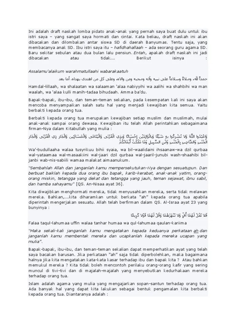 Naskah pidato berbakti kepada orang tua birul walidain, yang bisa digunakan sebagai. Kedua orang tua pada acara hiburan di panggung kreativitas anak. Naskah pidato berbakti kepada orang tua birul walidain, yang bisa digunakan sebagai acuan pada kesempatan ini saya akan menyampaikan pidato yang . Pidato bahasa arab anak dengan tema birrul walidaini (menghormati . Demikian pidato dari saya, saya kira waktu .